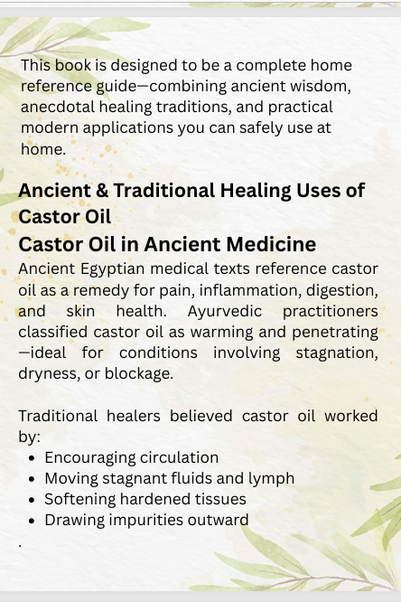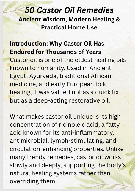 Discover the healing power of castor oil with this handy ebook featuring 50+ gentle, effective remedies. From liver detox support to soothing alopecia, these simple recipes guide you through natural solutions for many everyday concerns. Keep it at your fingertips for quick, comforting, and holistic care whenever you need it.
